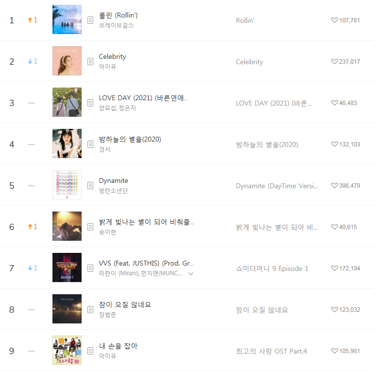 [2021년3월10일]멜론일간차트 TOP17, 1위-롤린 브레이브걸스(Rollin'/Brave Girls/듣기/가사) 본문