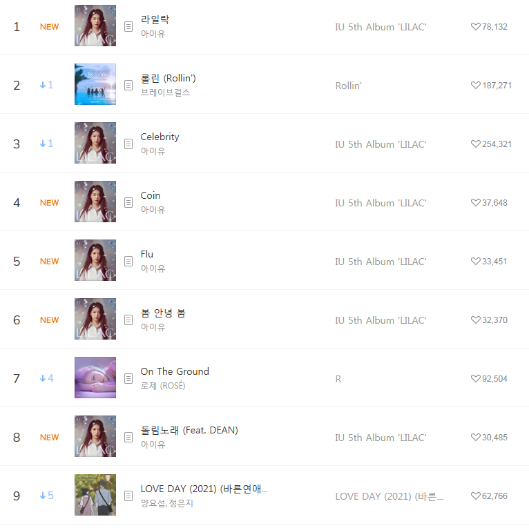 [2021년3월25일]멜론일간차트 TOP17, 1위-아이유 라일락(IU/LILAC/듣기/가사/동영상)
