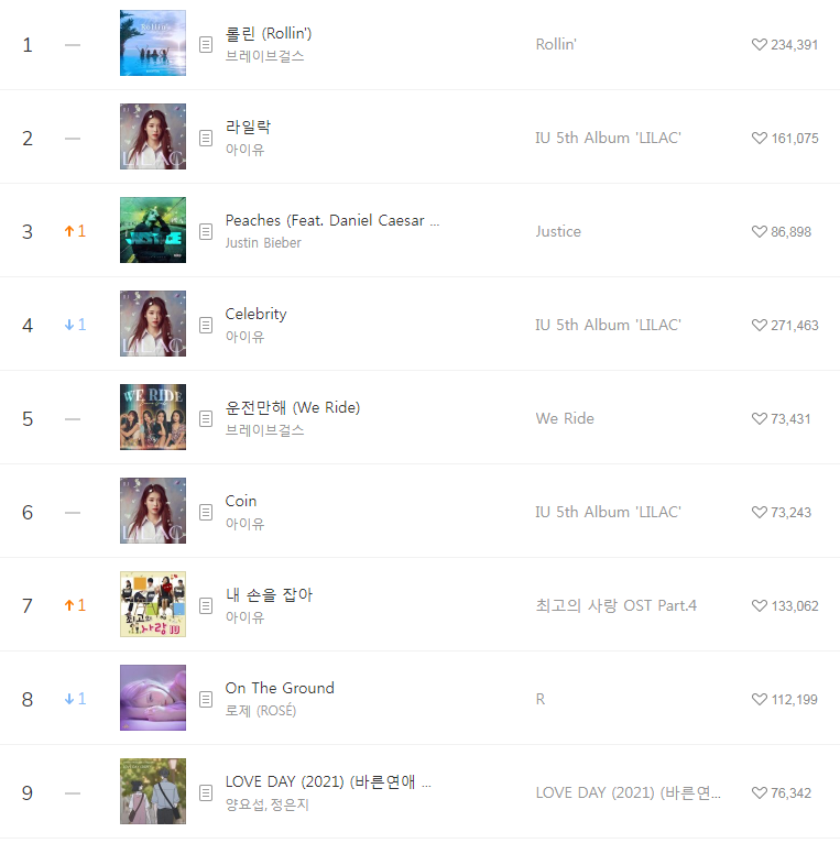 [2021년4월17일]멜론일간차트 TOP17, 1위-롤린 브레이브걸스(Rollin'/Brave Girls/듣기/가사/동영상)
