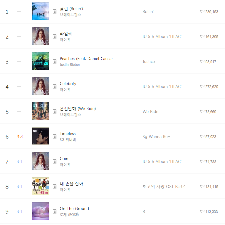 [2021년4월20일]멜론일간차트 TOP17, 1위-브레이브걸스 롤린(Rollin' Brave Girls/듣기/가사/동영상)