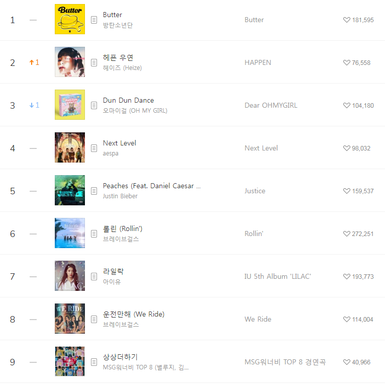 [2021년6월7일]멜론일간차트 TOP17, 1위-방탄소년단 Butter(BTS/버터/듣기/가사/동영상) 본문
