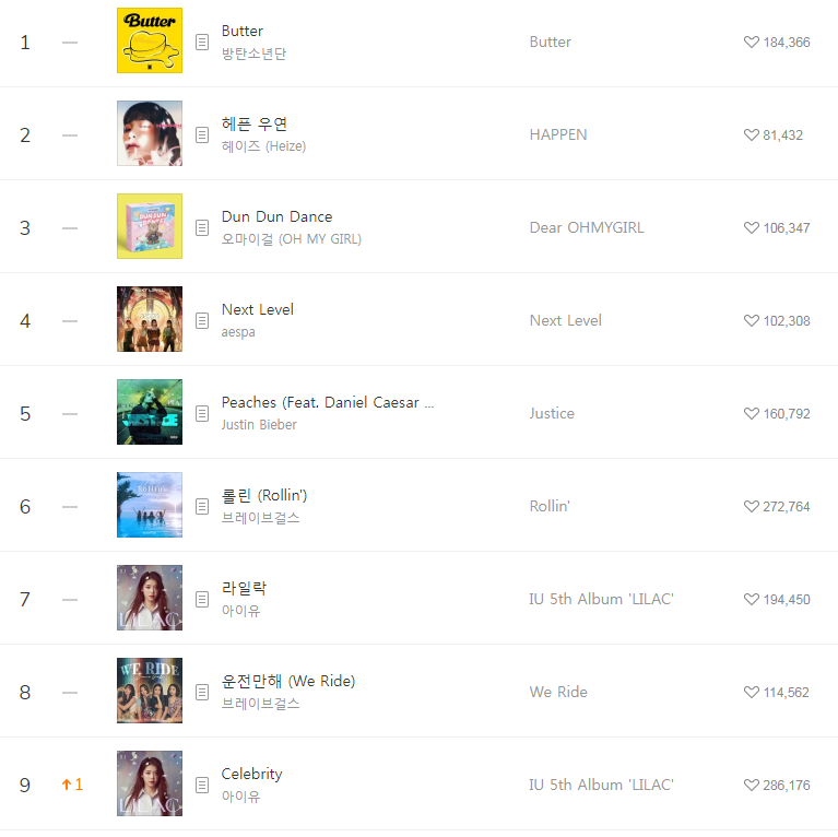 [2021년6월9일]멜론일간차트 TOP17, 1위-Butter 방탄소년단(BTS/버터/듣기/가사/동영상) 본문