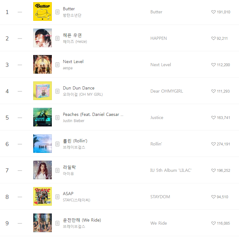 [2021년6월14일]멜론일간차트 TOP17, 1위-BTS Butter(방탄소년단/버터/듣기/가사/동영상)