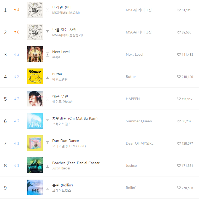 [2021년6월27일]멜론일간차트 TOP17, 1위-MSG워너비(M.O.M) 바라만 본다(듣기/가사/동영상) 본문