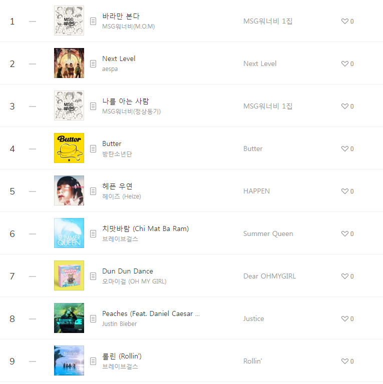 [2021년6월30일]멜론일간차트 TOP17, 1위-바라만 본다 M.O.M(MSG워너비/놀면뭐하니/듣기/가사/동영상) 본문