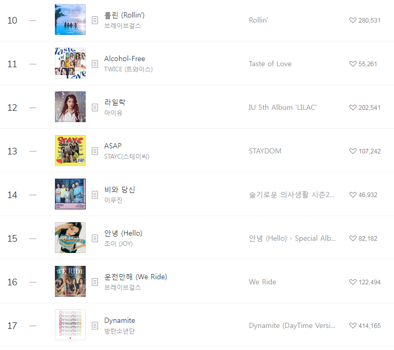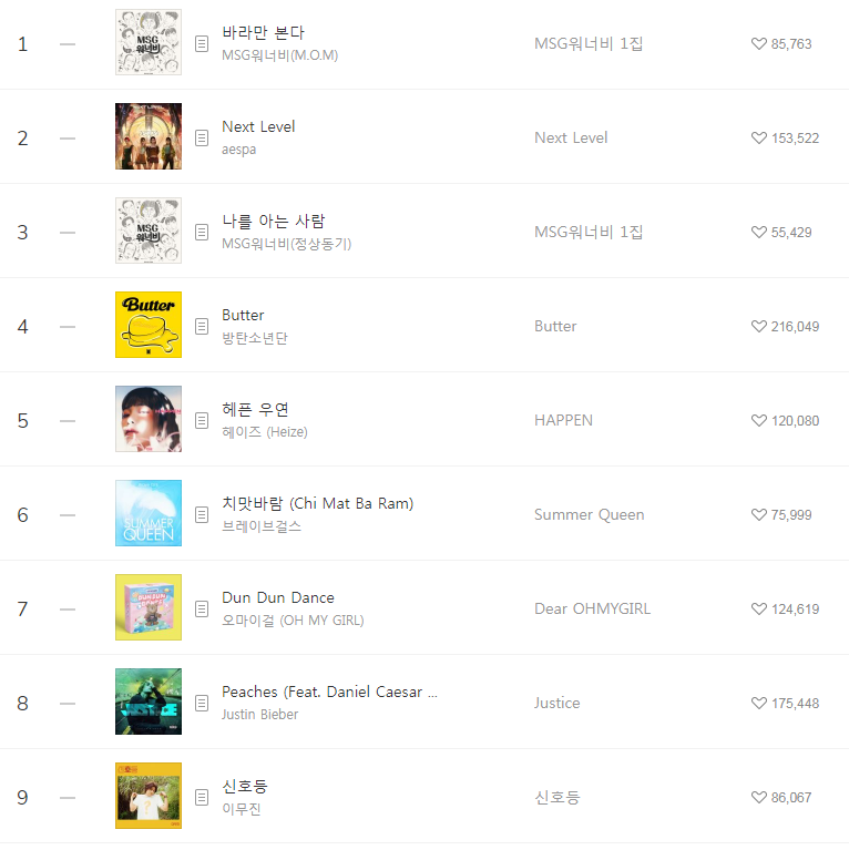 [2021년7월5일]멜론일간차트 TOP17, 1위-MSG워너비 바라만 본다(M.O.M/놀면뭐하니/듣기/가사/동영상) 본문