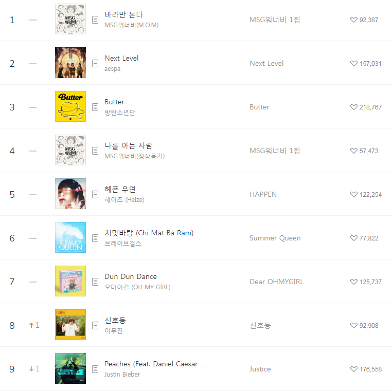 [2021년7월8일]멜론일간차트 TOP17, 1위-M.O.M 바라만 본다(MSG워너비/놀면뭐하니/듣기/가사/동영상) 본문