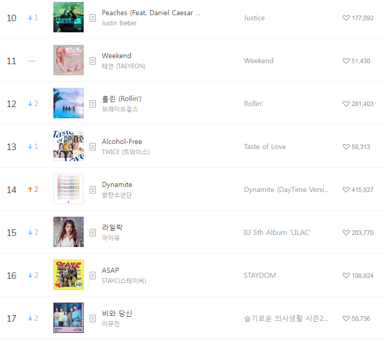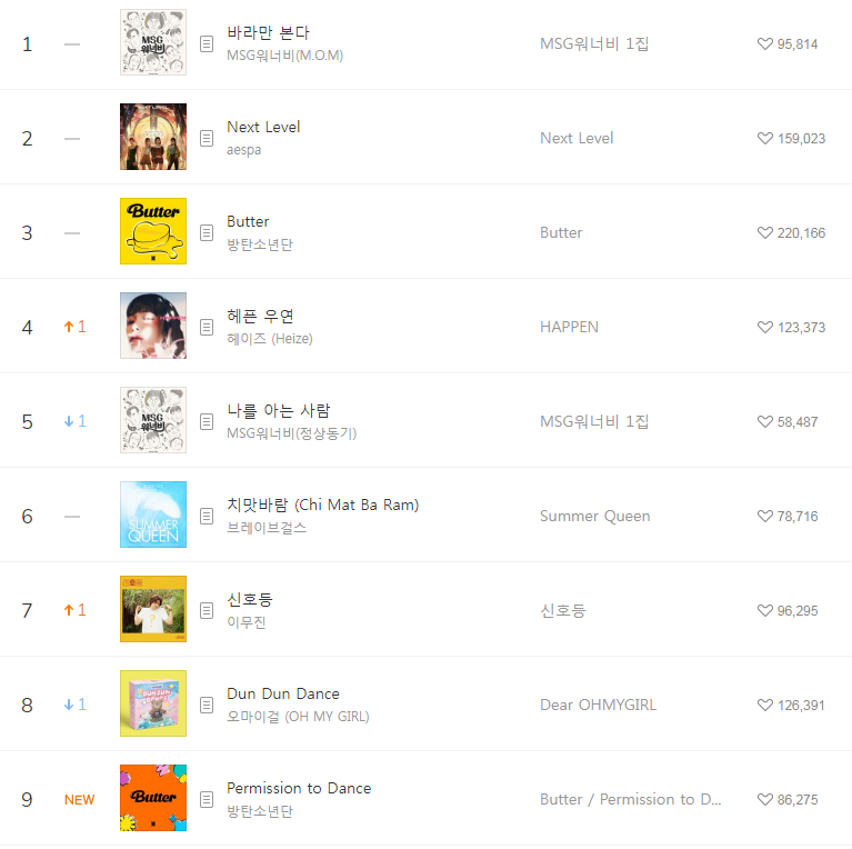 [2021년7월9일]멜론일간차트 TOP17, 1위-MSG워너비 바라만 본다(M.O.M/놀면뭐하니/듣기/가사/동영상) 본문