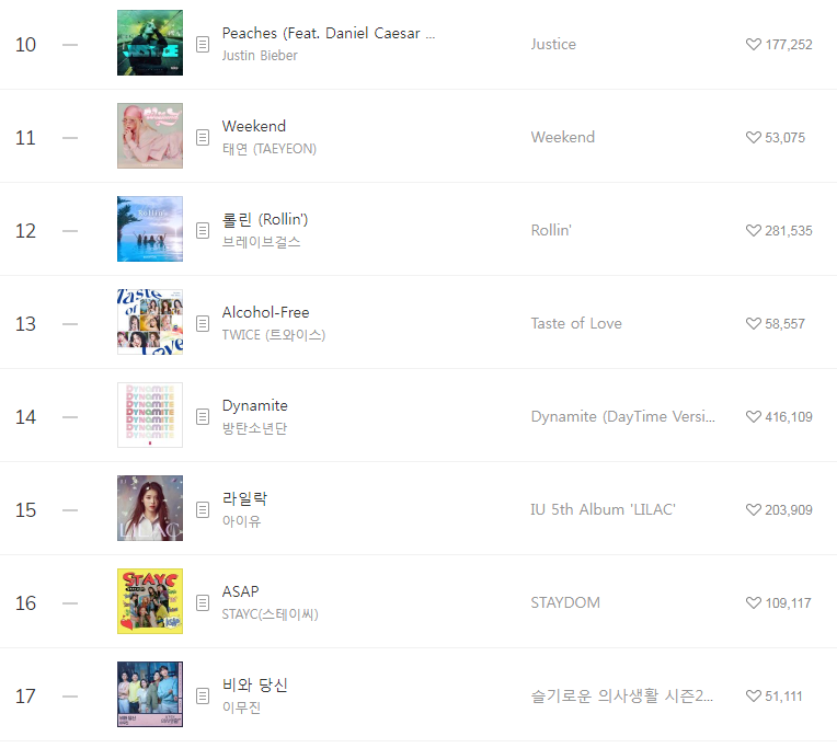 [2021년7월10일]멜론일간차트 TOP17, 1위-바라만 본다 MSG워너비(M.O.M/놀면뭐하니/듣기/가사/동영상)