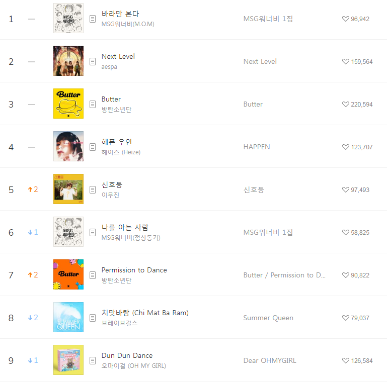 [2021년7월10일]멜론일간차트 TOP17, 1위-바라만 본다 MSG워너비(M.O.M/놀면뭐하니/듣기/가사/동영상) 본문