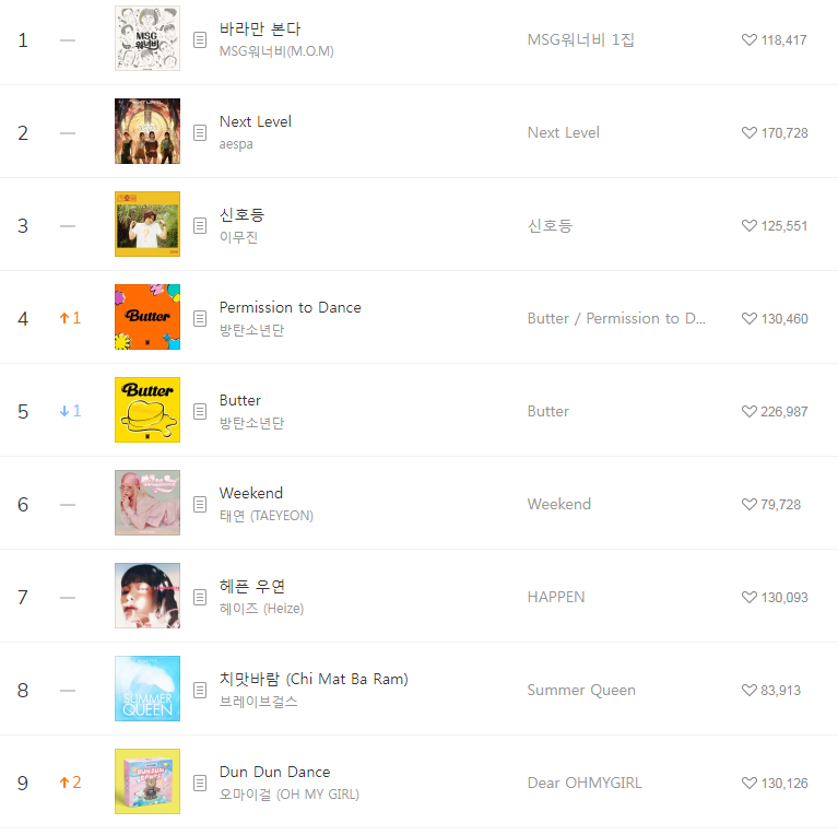 [2021년7월20일]멜론일간차트 TOP17, 1위-바라만본다 MSG워너비(M.O.M/놀면뭐하니/듣기/가사/동영상)