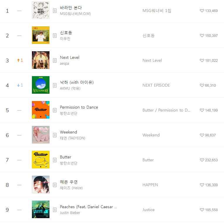 [2021년8월3일]멜론일간차트 TOP17, 1위-MSG워너비 바라만본다(M.O.M/놀면뭐하니/듣기/가사/동영상) 본문