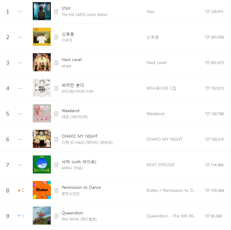 [2021년9월11일]멜론일간차트 TOP17, 1위-저스틴비버 STAY(The Kid LAROI/Justin Bieber/듣기/가사/동영상)