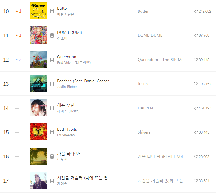 [2021년9월18일]멜론일간차트 TOP17, 1위- The Kid LAROI, Justin Bieber STAY(저스틴비버/듣기/가사/동영상) 본문