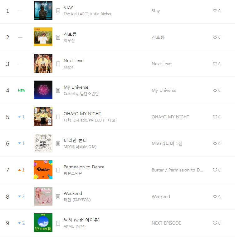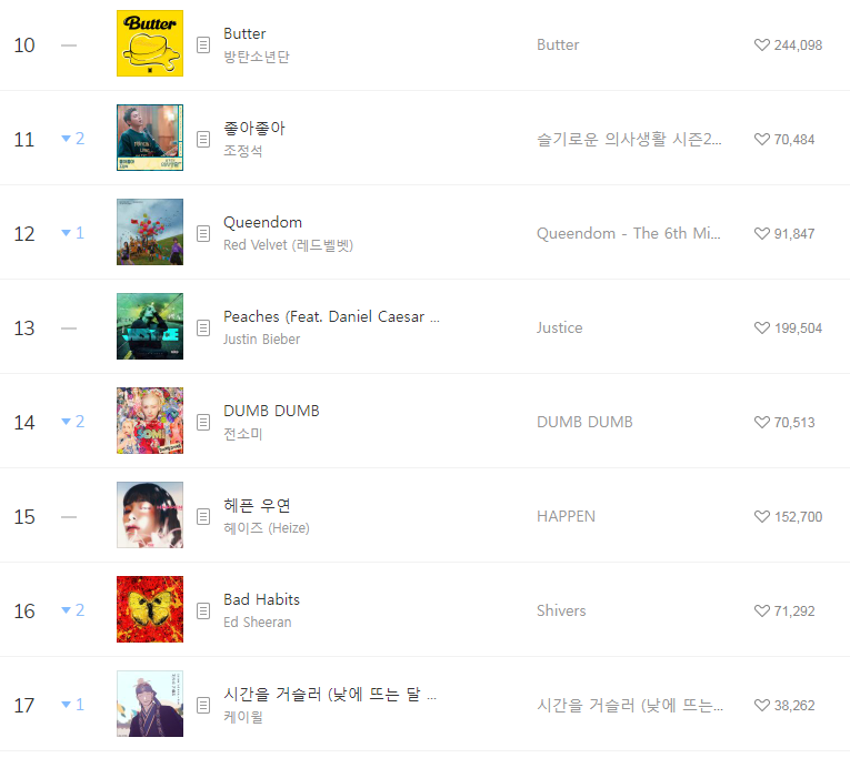 [2021년9월24일]멜론일간차트 TOP17, 1위-저스틴비버 STAY The (Kid LAROI/Justin Bieber/듣기/가사/동영상)