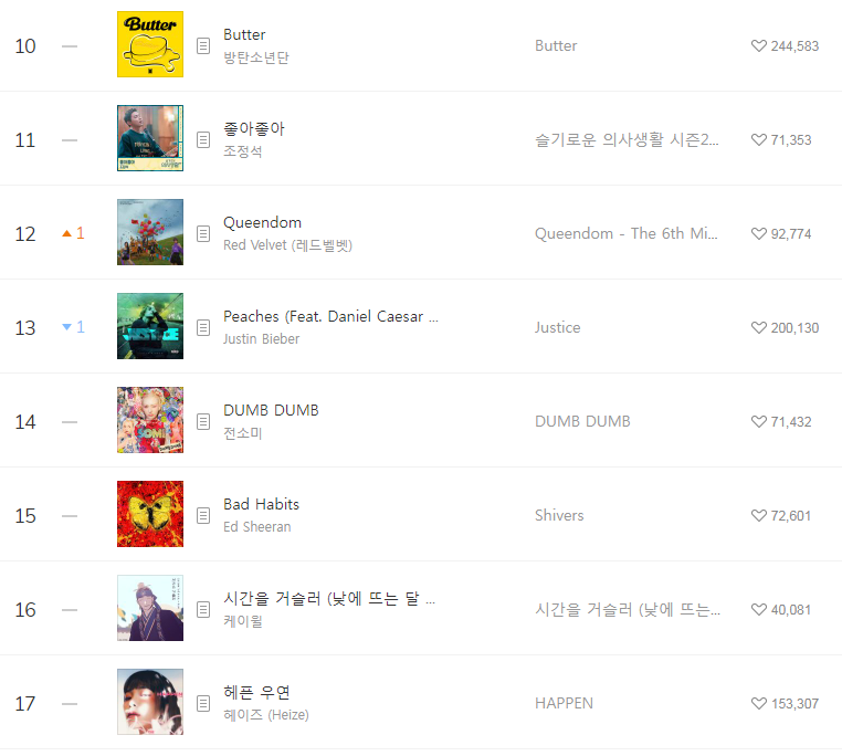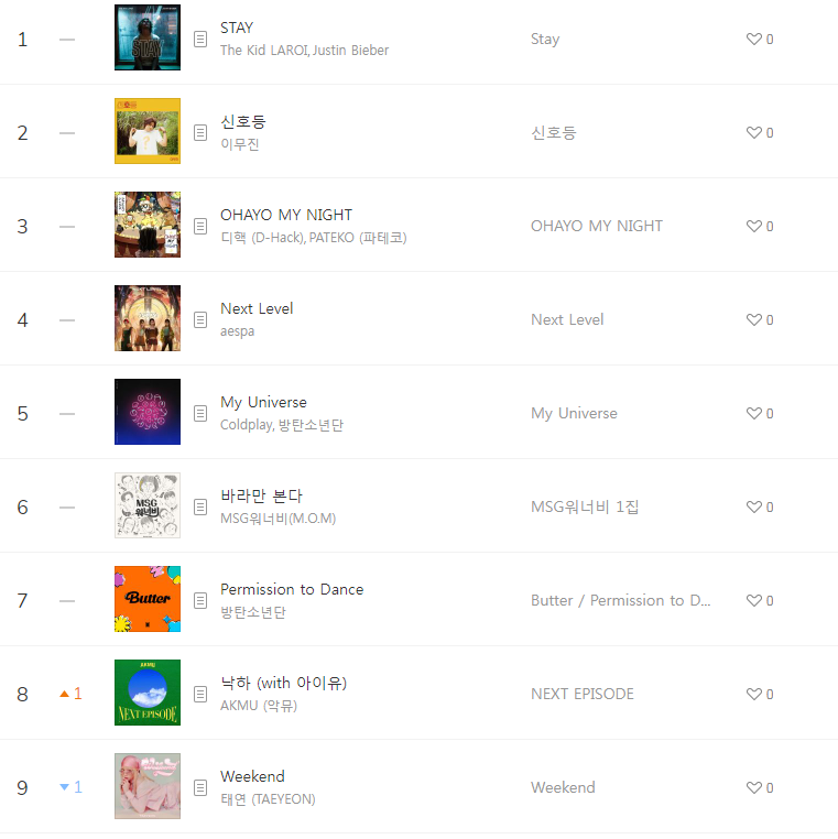 [2021년9월27일]멜론일간차트 TOP17, 1위-저스틴비버 STAY The (Kid LAROI/Justin Bieber/듣기/가사/동영상)