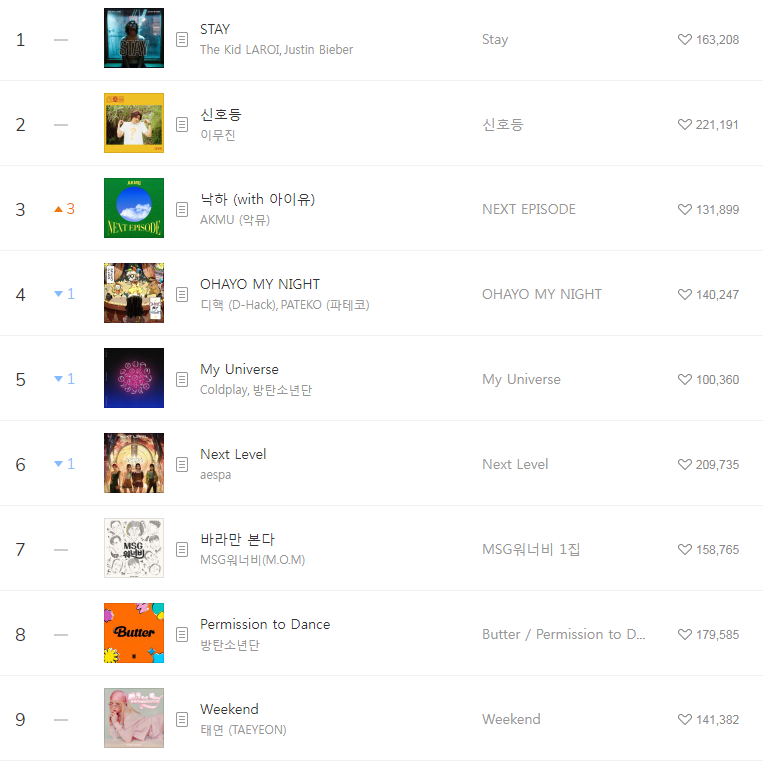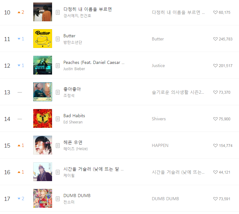 [2021년10월4일]멜론일간차트 TOP17, 1위-저스틴비버 STAY The (Kid LAROI/Justin Bieber/듣기/가사/동영상)
