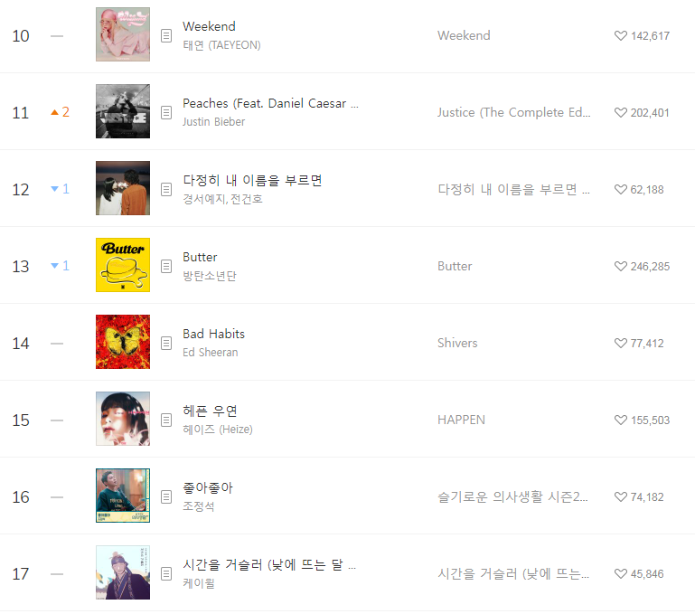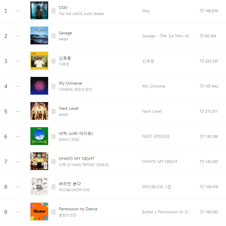 [2021년10월8일]멜론일간차트 TOP17, 1위-STAY The Kid LAROI Justin Bieber(저스틴비버/듣기/가사/동영상) 본문